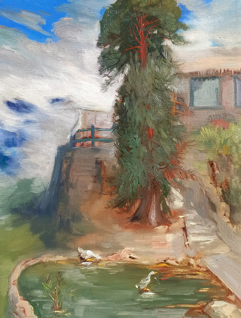 “午后山村”,阳光透过稀疏的云层,洒落在古朴的屋檐,金色的光辉与青灰的瓦片交织,勾勒出一幅温馨而宁静的画面。柯建东的笔触细腻而富有层次,每一抹色彩都是对午后时光的温柔诠释,让人仿佛能听见远处传来的鸡鸣犬吠,感受到那份闲适与恬淡。