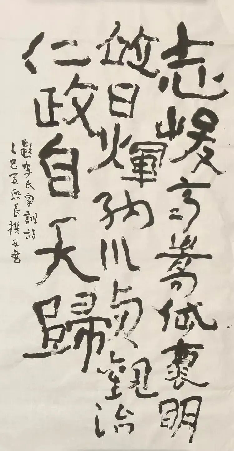三是倡导“写大字立大志”的美育观。金熙长对当下书法教育中过度追求“媚秀小字”的现象提出了批判,他认为这种倾向容易导致学生养成“精致的利己主义者”的心态。他呼吁青少年应以长锋羊毫或斗笔临习汉魏摩崖石刻,通过书写榜书来培养“厚朴宽博的胸怀”。在他看来,书法不仅是一种艺术形式,更是一种修身养性的方式,通过书写大字,可以让人开阔心胸,培养远大的志向与高尚的品德。同时,他强调书法家应“求学于天地”,从大自然中汲取灵感,将自然之美融入书法创作,以高古的线条抒写大国风度,展现书法艺术的雄浑气魄与文化自信。