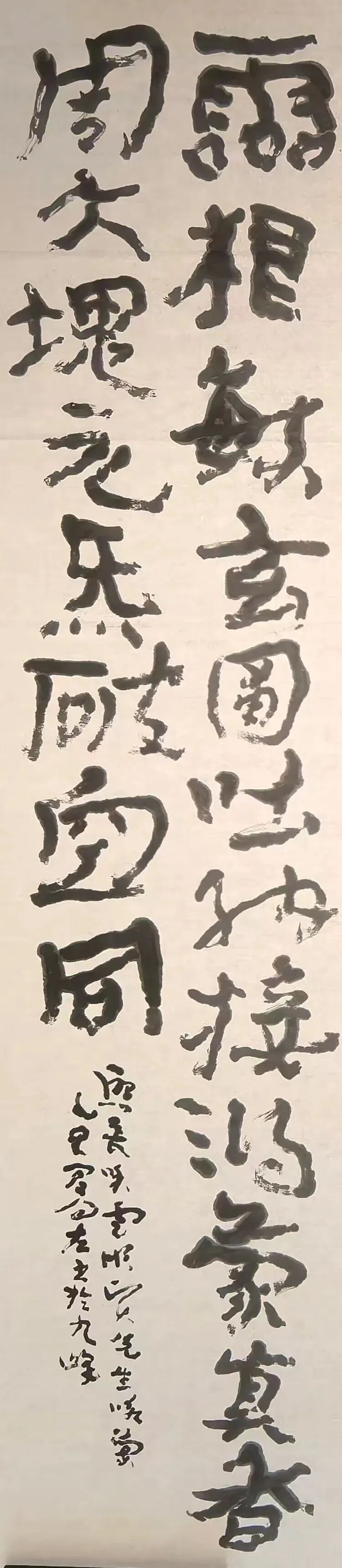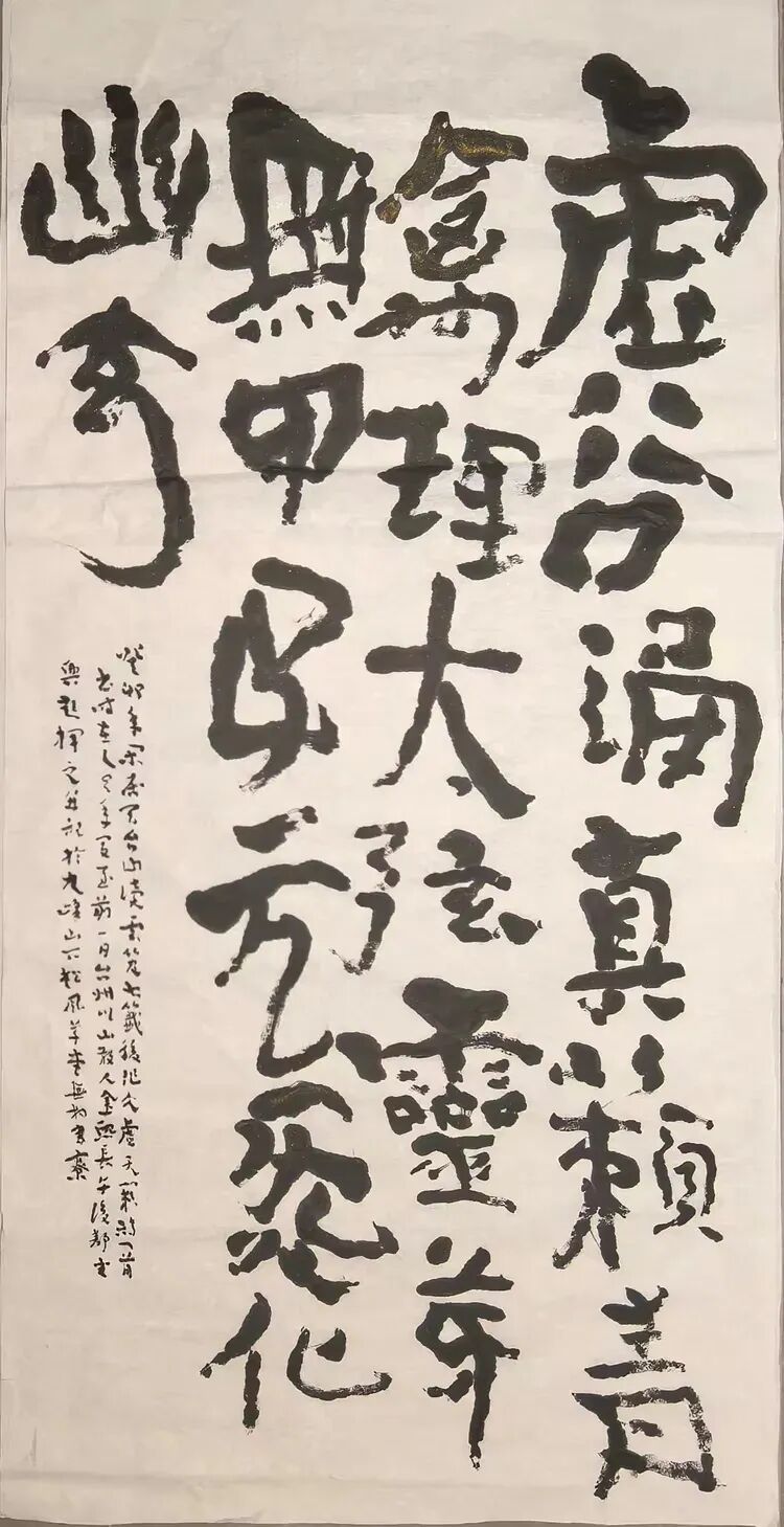 其作品呈现出“奇拙野逸”的风貌。“鲸镗狮座”四字在笔法和结构上,不拘泥于常规的书写规范,笔画形态独特,结构看似随意却蕴含着一种别样的秩序。“本来空无”则是一种精神气质,尤其是“本”字,笔下有一种自由奔放、不受拘束的感觉,仿佛是从自然中汲取灵感,带着一种原始的生命力,给人以强烈的视觉冲击。