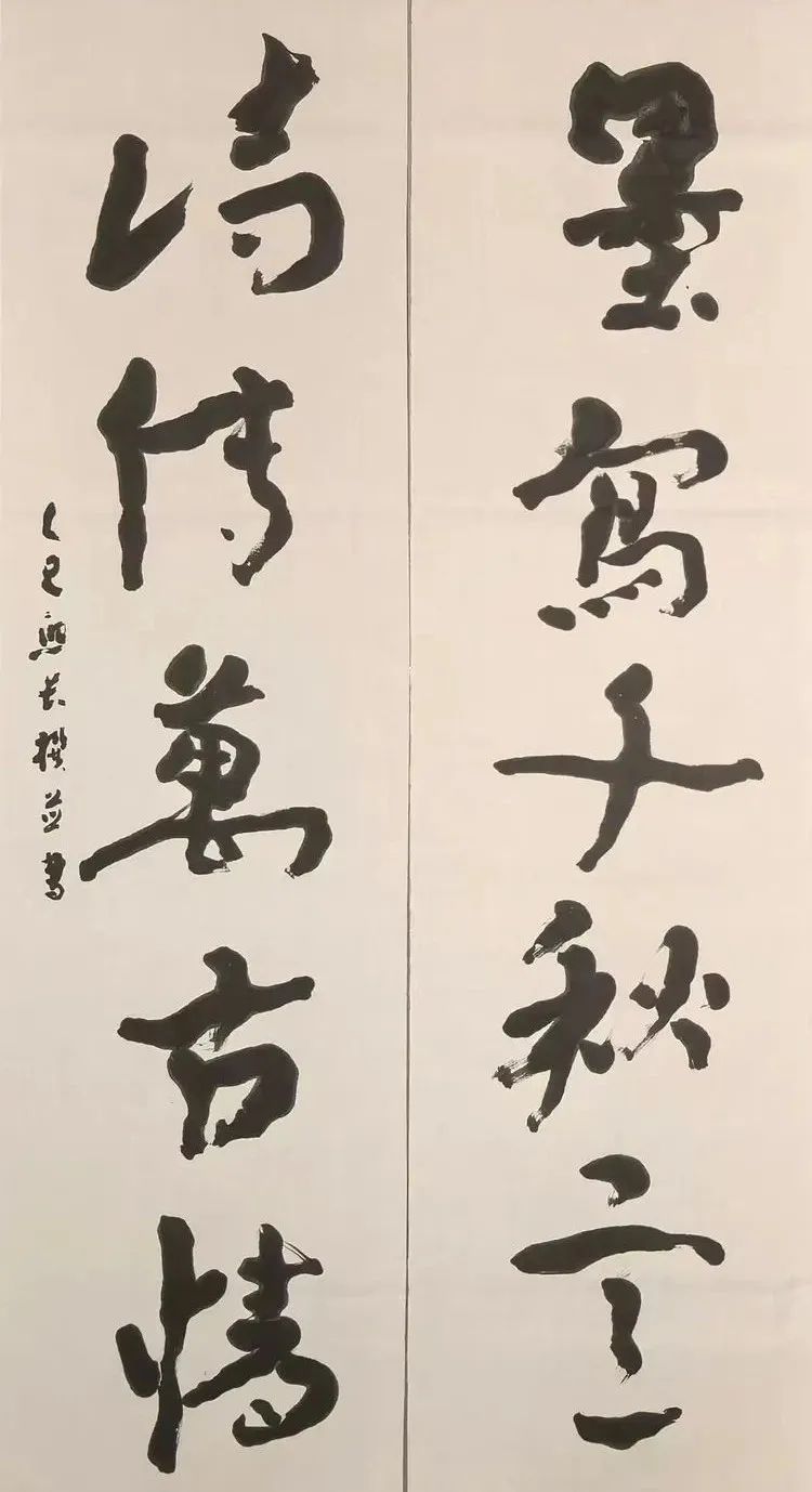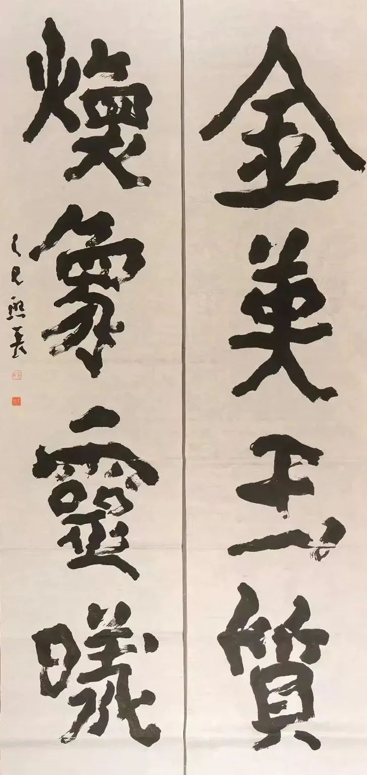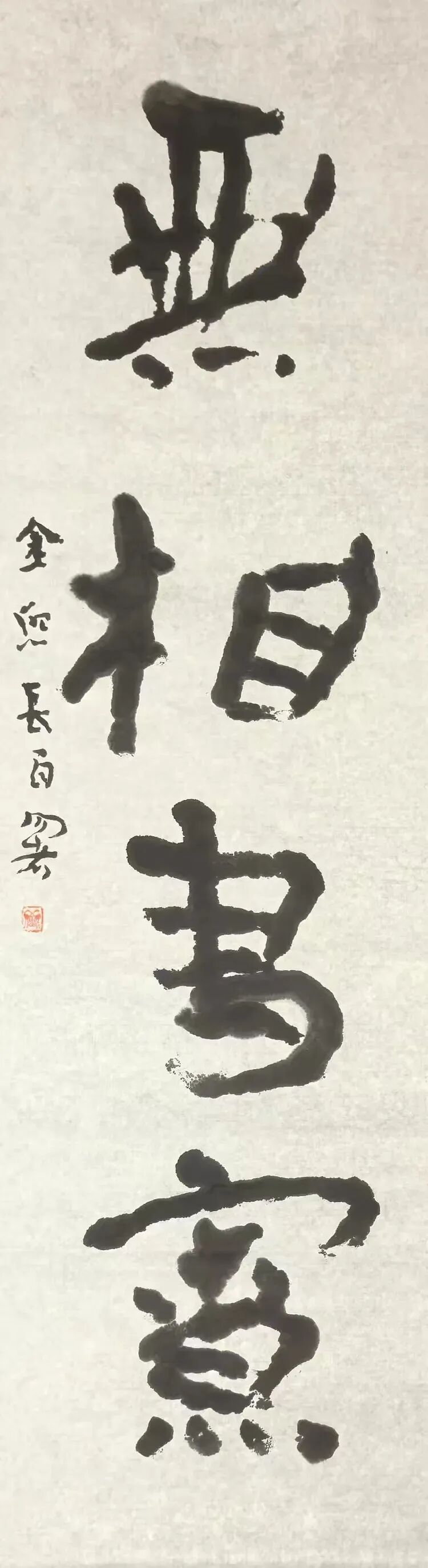 观其书相,每幅作品引《毛公鼎》高古笔意融之;采汉魏摩崖石刻化之,字间留白如云岫出谷,品其尺八屏榜书对联有临“空潭泻春”之境!如金氏在其《飞白论》中有云:“虚白非空,乃元神往来之径”,有“目随鹤远,神游太始”之感,令观者烦恼冰释!