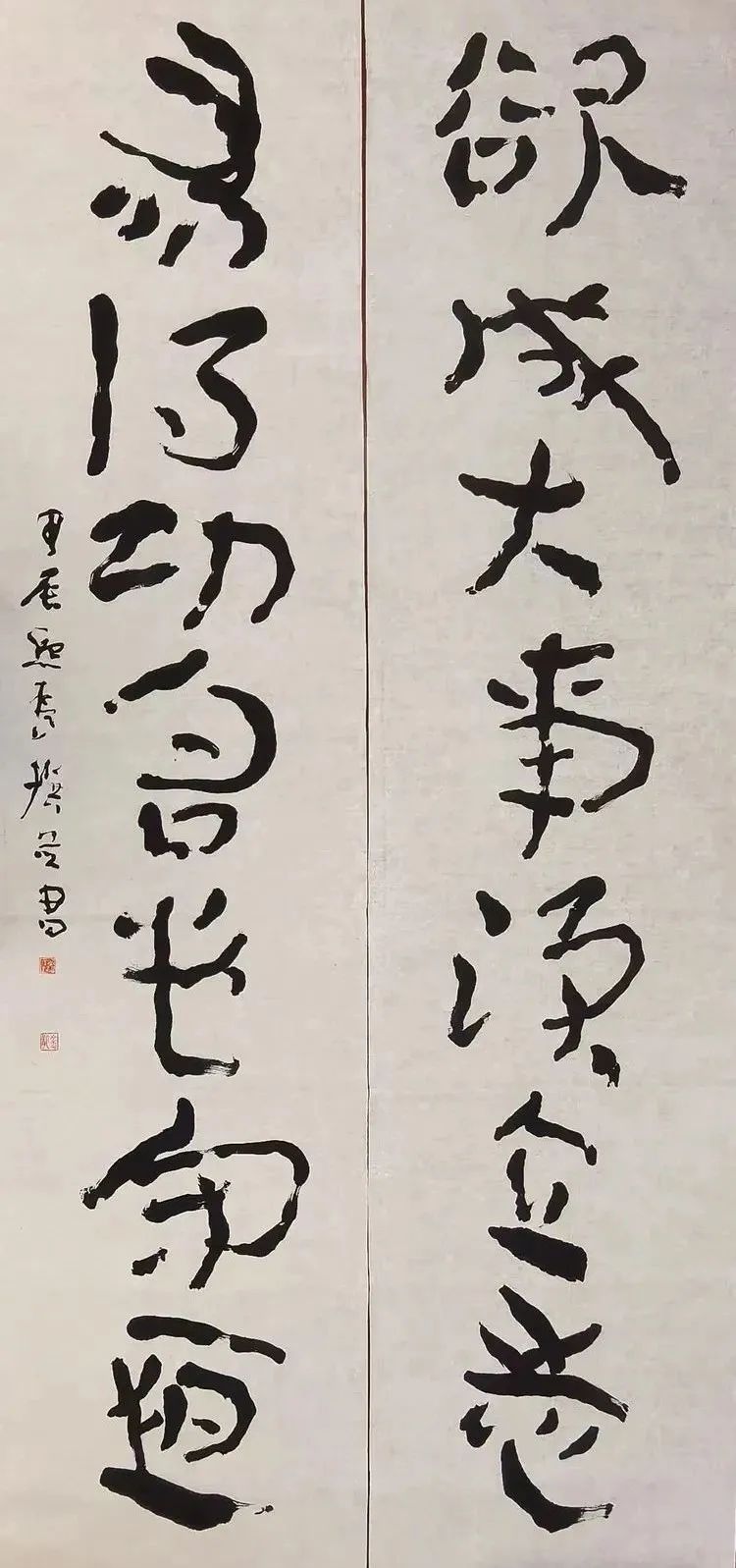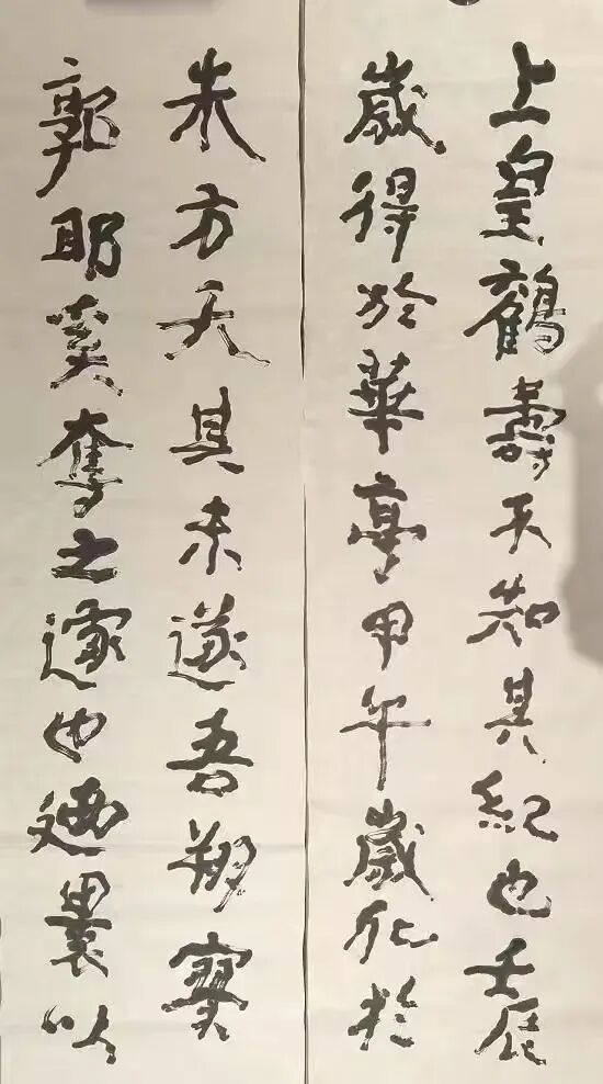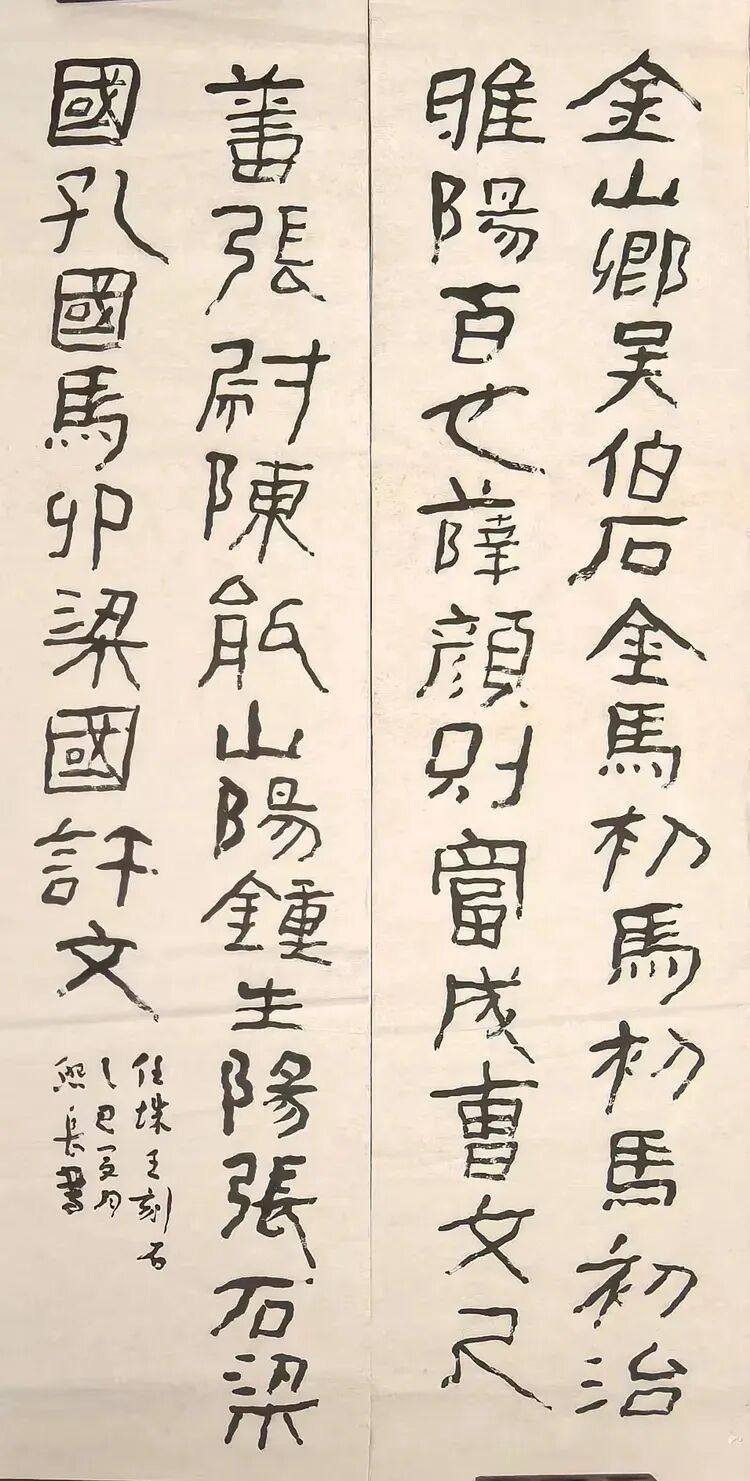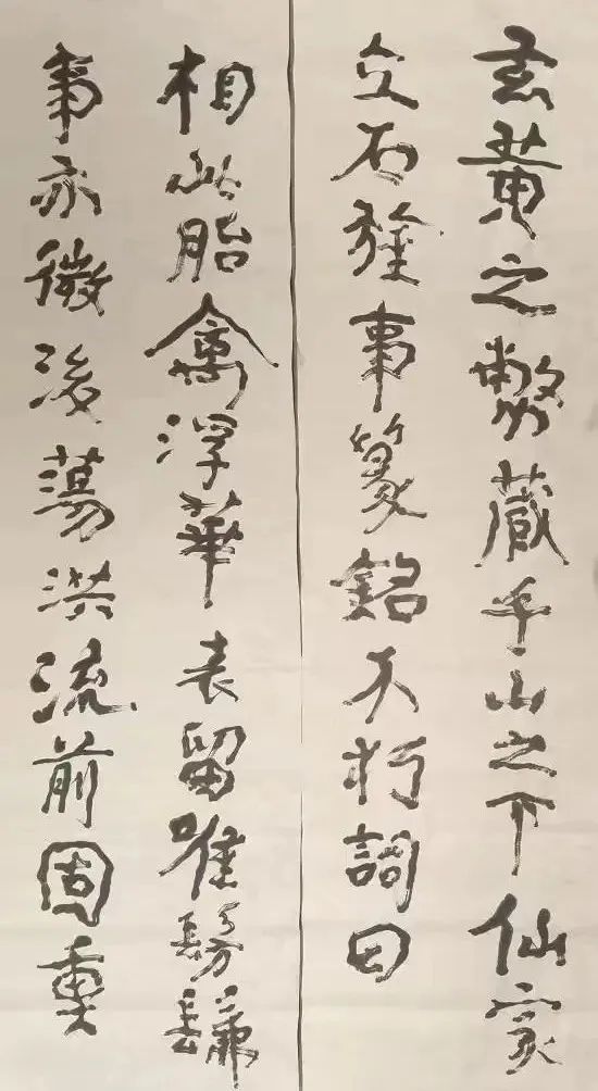 观其书相,每幅作品引《毛公鼎》高古笔意融之;采汉魏摩崖石刻化之,字间留白如云岫出谷,品其尺八屏榜书对联有临“空潭泻春”之境!如金氏在其《飞白论》中有云:“虚白非空,乃元神往来之径”,有“目随鹤远,神游太始”之感,令观者烦恼冰释!