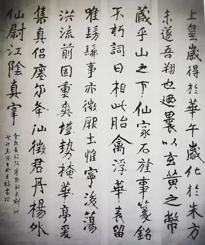 尤为重要的是,金先生深研碑学,曾多次撰文提出独到见解:如“毛公鼎”文字可视为本源“音符或图符”,其精神能量可投射于后世历代碑版法帖,揭示了书法的贯通性。他更将书道置于宏阔宇宙观中阐述:“天地人书浑然一体”,从浩瀚星宇到人体脏腑思维,皆是一体之化生。故其核心理念“书道即天道之微缩”,不仅是艺术追求,更是以笔墨为舟筏,渡人领悟天地至理、复归无极的仙学实践。其书作与理论,实为叩问天道、启迪性灵之瑰宝。
