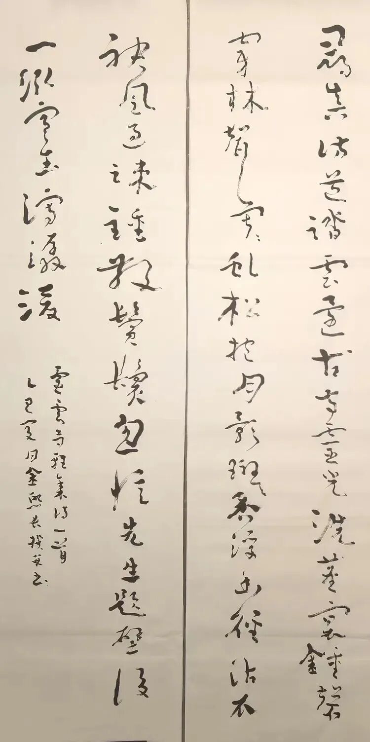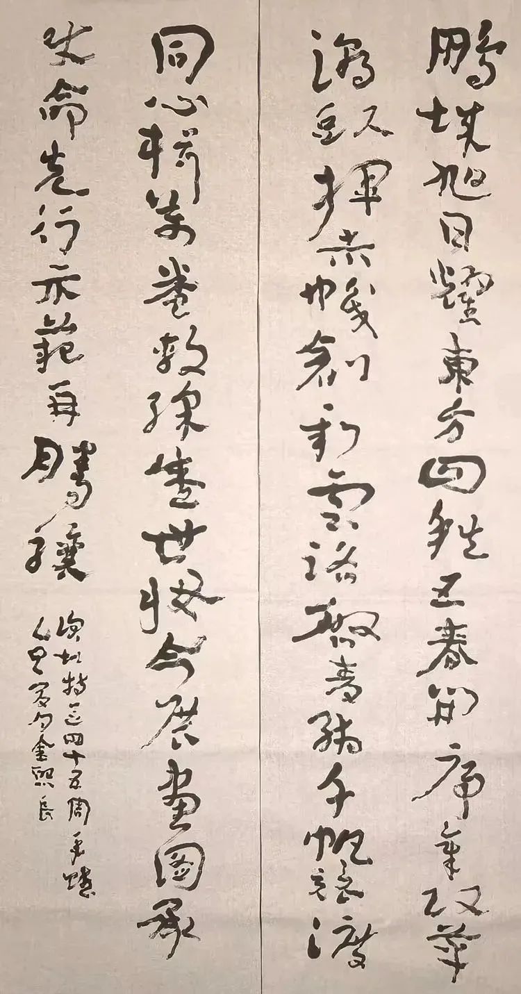 “无法无技,不求讨好”反映了金熙长草书创作的理念。在书法创作中,很多人追求技巧的娴熟和规范的遵循,但金熙长反其道而行之。“月照金经”四字,超越了一般意义上的技法束缚,追求一种更高层次的艺术境界。这种境界不是为了迎合观众的审美,而是为了表达自己内心深处的情感和对书法艺术的独特理解。这使得他的作品具有一种纯粹性,不是为了取悦他人,而是忠于自我甚至忘记数十年来所学的一切技法。
