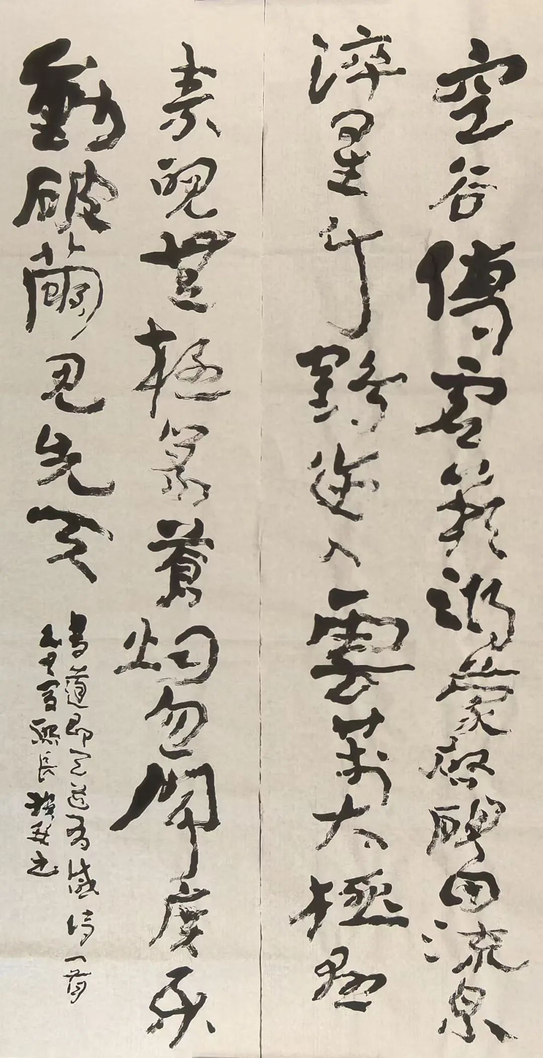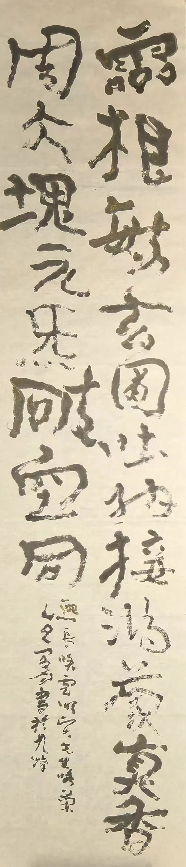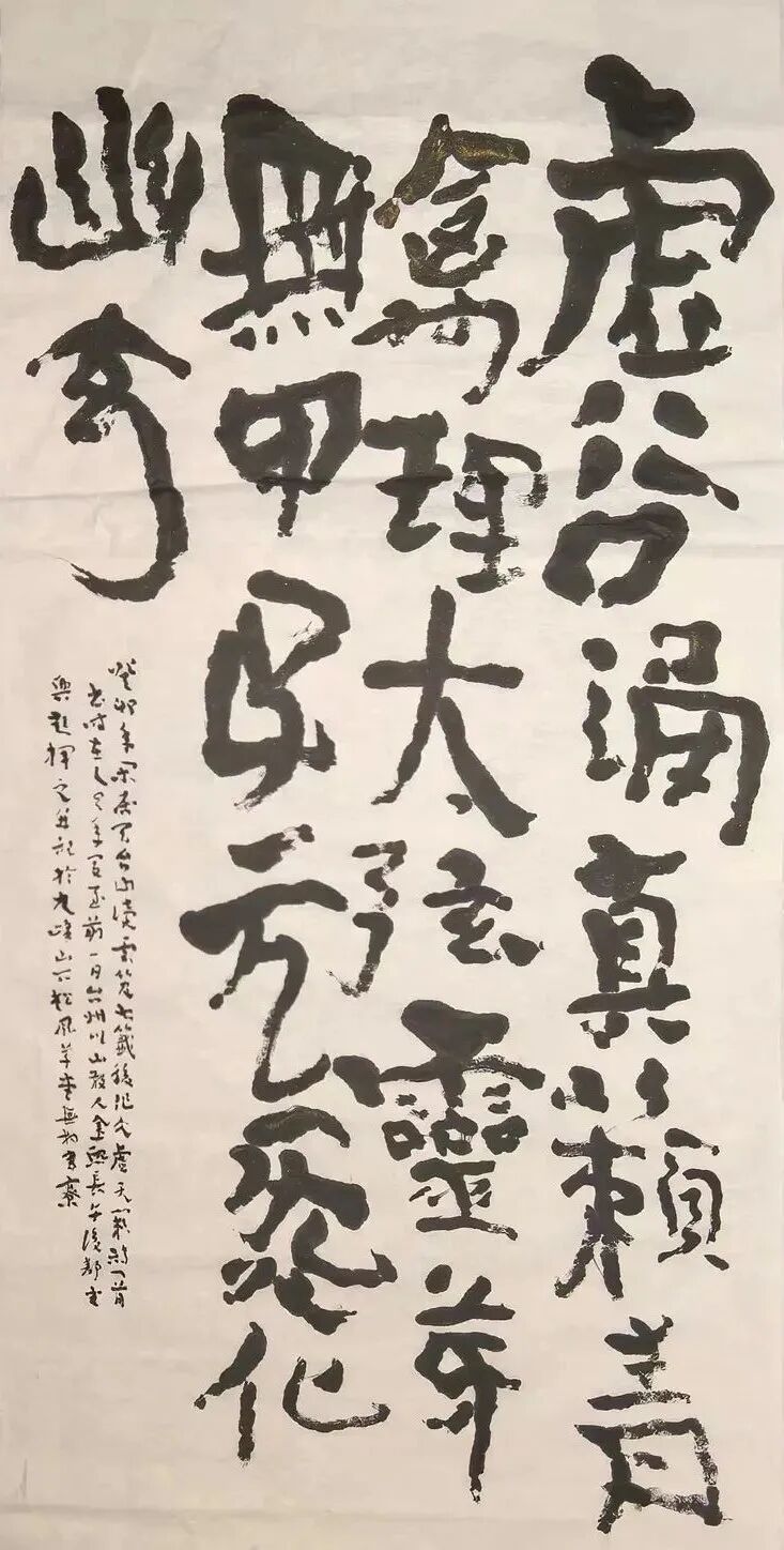 其作品呈现出“奇拙野逸”的风貌。“鲸镗狮座”四字在笔法和结构上,不拘泥于常规的书写规范,笔画形态独特,结构看似随意却蕴含着一种别样的秩序。“本来空无”则是一种精神气质,尤其是“本”字,笔下有一种自由奔放、不受拘束的感觉,仿佛是从自然中汲取灵感,带着一种原始的生命力,给人以强烈的视觉冲击。