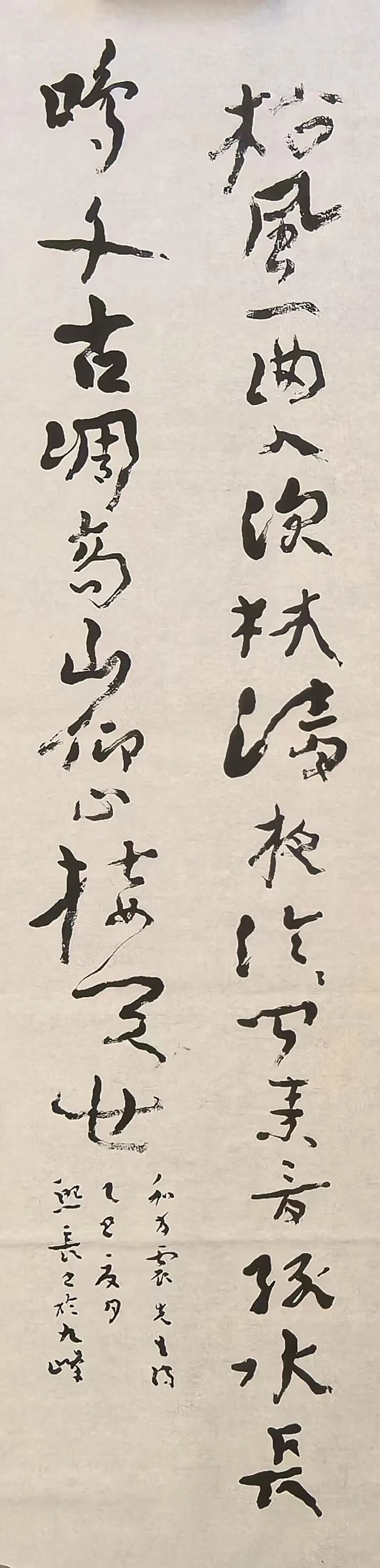 此作开笔“松风”二字,用枯笔入纸,一股老松寒风之息扑入眼帘,其书境有如孟郊之诗境。通篇长锋用笔,有提有按,轻重墨色对比强烈,整体汉魏气息贯彻始终。“闻素音”的三横笔方笔有变,放松而有力,有如“琳琅振响,琴声悠悠”,“千古”的“千”横笔左高右低的反常写法有如长河,与“古”字鮮明对比,篆笔“心”收篇,墨色亦首尾呼应,引人遐想。