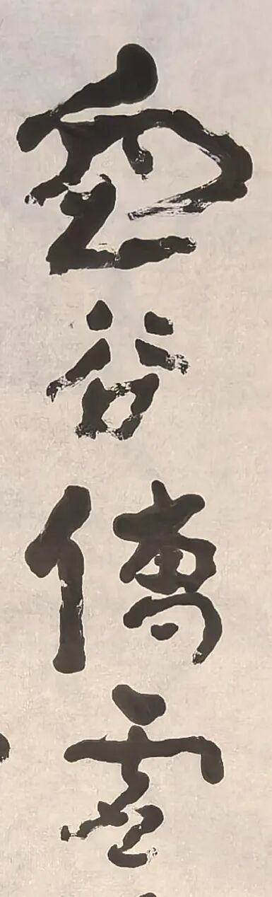 这种深沉不是闷响,而是金石共振激发的地脉次声。看《虢季子白盘》的底纹,那些水波其实是青铜和磬石共鸣的波形图。我创造了“颤沙法”来写《熙长和卢顺贤诗咏兰》之“灵根毓玄”四字中的靈字三个口:笔肚蘸上淡墨,神态各异,像钟落到祭坛上,接着立刻高频快速内力抖动,线条暗藏波澜,模仿磬石的震颤,飞溅的墨粒就像震波惊起的沙尘,一气呵成写到玄字。