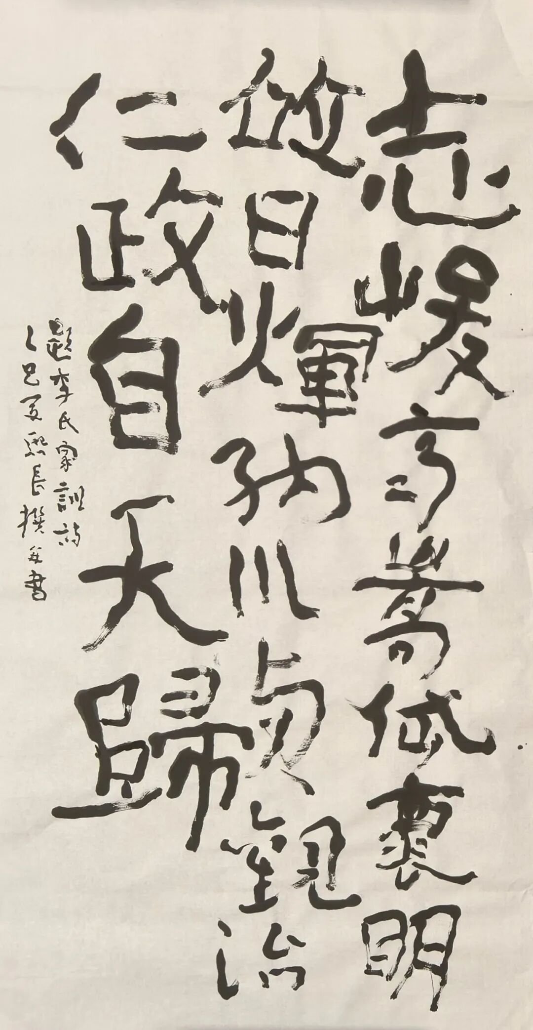 自作诗《李氏家训赞》吸墨的地方,其实是自由电子奔涌的费米海。写这笔时,我幻想笔尖是扫描隧道显微镜的探针。工作室的朋友看到字后惊叹:“老疯子把电镜图写成书法了!”