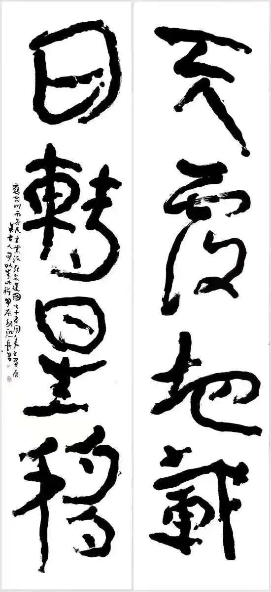 金师的篆籀笔法,灵动地将这七重天机化入创作血脉。其线条绝非一味平匀迟涩,而是在千钧凝重中蕴藉勃然不可遏之动势,书写出如金石撞击般铿锵的节奏与悠远绵长的韵律,仿佛笔锋行走处自有黄钟大吕之声相随。同时,先生大胆突破陈规,字形结构奇崛多变:或修长如孤峰峙立,或略扁如古磐卧地,忽而倾侧生险绝之姿,忽而开张显宏阔之势,重心沉稳下移如根植厚土,左右参差错落似星汉列张。虽乍看仿佛失衡欲坠,实则内含泰山磐石般的沉雄定力,于险绝中求衡稳,于动荡中寓永恒,焕发出强烈而独特的个人风神,如一段跌宕起伏却气韵贯通的古老乐章。