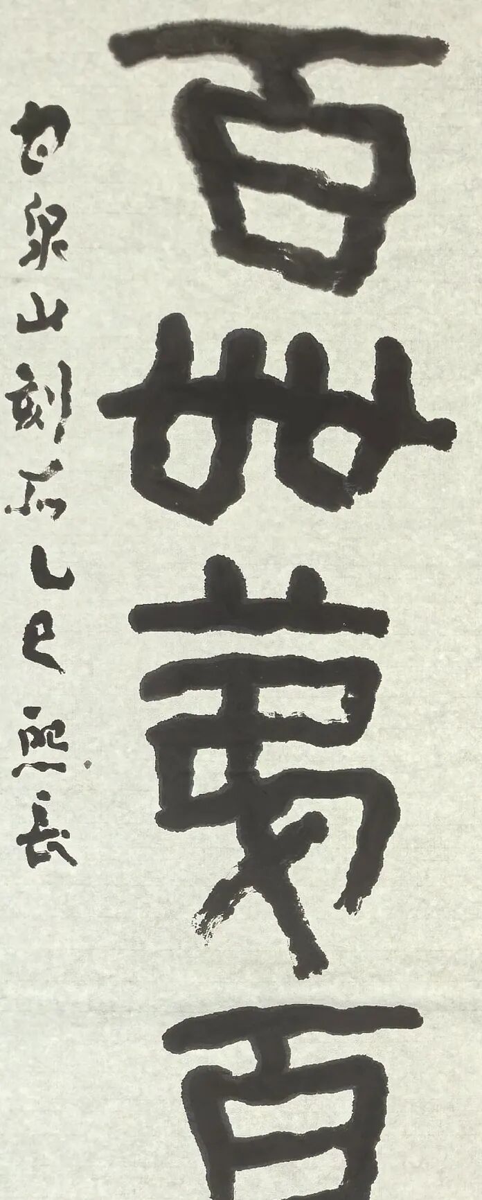 金师篆籀笔法理论之核心,在于对“金石器”七重境界的深刻体悟与精妙化现。如题图诗作,其笔下书法,绝非仅止于字形结构的平面经营,而是将柔毫淬炼为刻刀,令宣纸化作钟鼎碑石——每一次提按顿挫,皆是心力的“敲击”,于无声处“撞击”出斑驳淋漓、震人心魄的“金石感”。他善驭长锋羊毫,行笔以中锋为主,笔力千钧,如锥画沙,力透纸背,似有凿石铸铜之铿锵蕴于其间。墨色经营更是匠心独运,超脱均匀流滑之窠臼,刻意追求自然洇化与飞白之趣:浓重处如青铜锈蚀般层叠堆积,似熔铜浇铸时的凝重凝固之声;枯笔处似金属历经千年风雨剥蚀般苍茫,仿佛能听闻霜蚀冰泮、岁月剥落的簌簌微响。那些看似不经意的“破锋”、“飞白”,绝非技艺疏漏,实乃先生刻意为之的“天籁留痕”,旨在令宣纸之上重现青铜铭文历经千载风霜后特有的斑驳肌理、厚重质感与苍古意韵,并唤醒潜藏其间的历史回声。文中所举“西”字之峻拔如斧凿、“雲”字之舒卷含氤氲、“也壬辰”之古拙藏机趣、“鹤寿”之雍容蕴沧桑,正是此般“可视可听”之境界的淋漓展现。