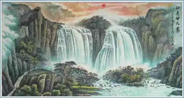 国画:神奇的九寨180cmx97cm(孤品)。刊登在本人出版的《中美建交37周年》的纪念邮册中。