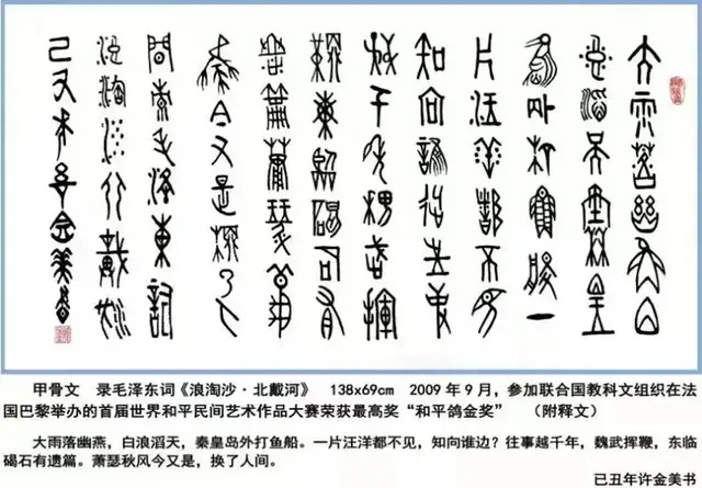 金字甲骨文十二生肖69X68mX12(孤品)。国家有关部门雕制在圆形的白色玉石上作为国礼由国家领导人赠送给外国元首。2024年11月,北京鸟巢组委会己定镌刻在水立方上,让国内外游人观赏。2024年荣获首届国粹文化金马奖。