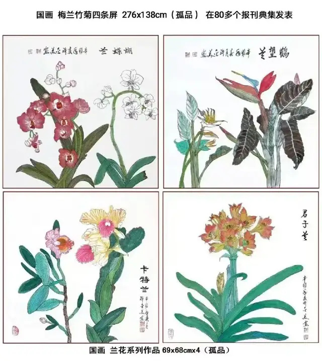 国画:兰花系列69cmx68cmx4(孤品),入选本人出版的国家邮册。