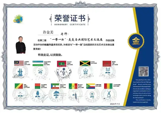 同时,2024年参加第六届社会美育国际艺术节绘画大赛荣获“特等奖”。