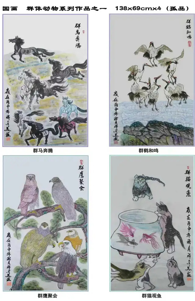 国画:动物系列138cmx69cmx8(孤品)。在国内外书画集发表5次。