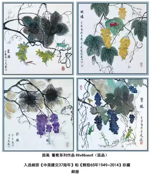 国画:葡萄系列69cmx68cmx4(孤品)。入编本人出版的国家邮册。