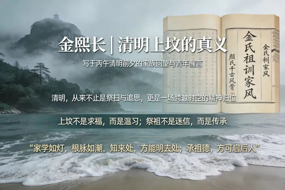 金熙长先生以天台山雾为引,以家学宗谱为脉,将个人半生行迹、金氏祖训家风与颜氏千古风骨熔于一炉,在潮起潮落间道破清明真义:上坟不是求福,而是温习;祭祖不是迷信,而是传承。